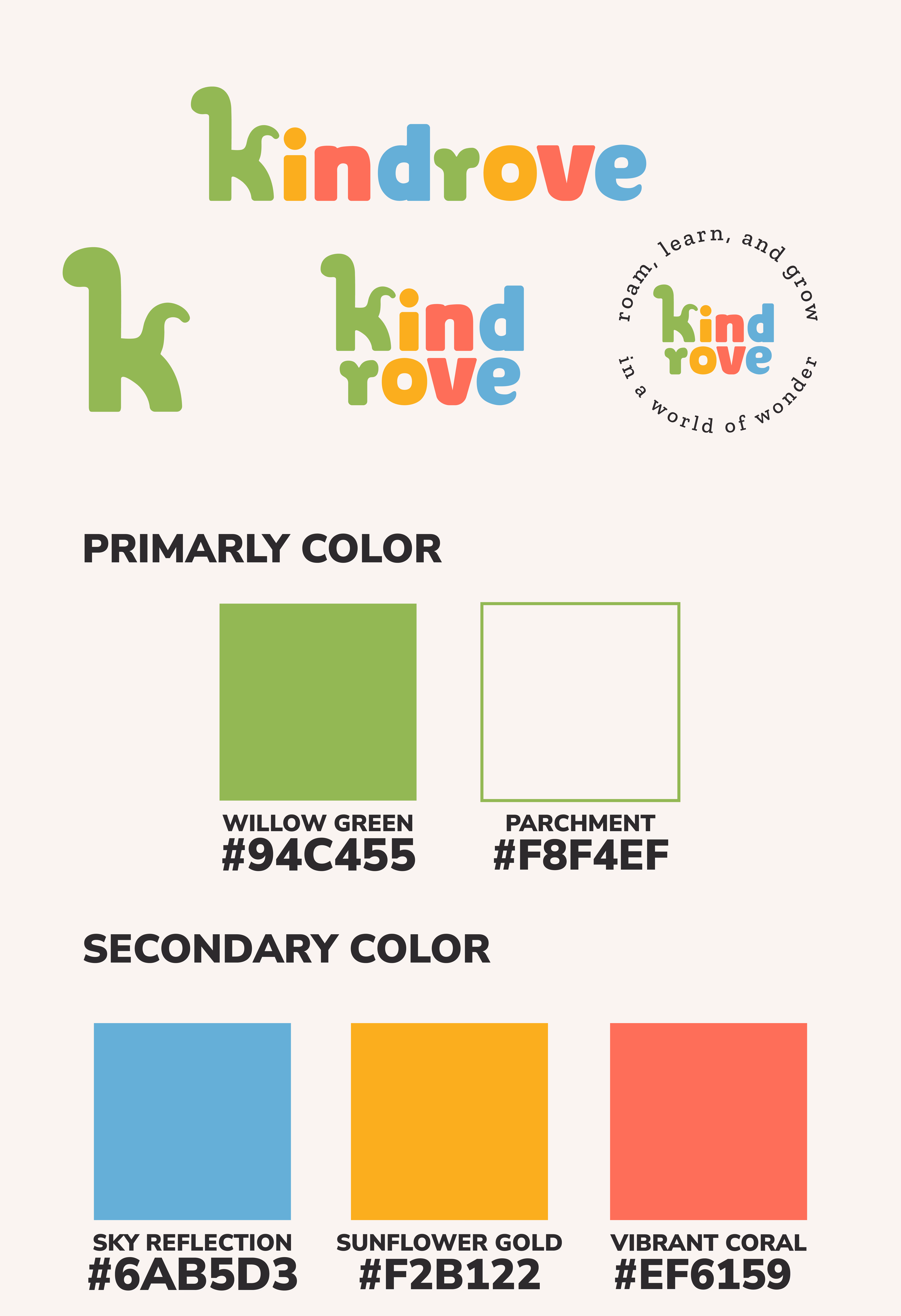 Kindrove's color palette draws from nature and energy, with primary shades like Willow Green for growth and freshness, paired with Parchment for a clean, neutral background. Secondary colors include Sky Reflection for calm skies, Sunflower Gold for sunny optimism, and Vibrant Coral for lively accents, creating a balanced, child-friendly scheme that feels warm and inviting.